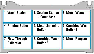 This topic lists the required hardware, software, cartridges and labware, and reagents for running the IMAC Cartridge Customization protocol. If you have questions about these items, contact Agilent Customer Service.The following figure and table show the components of the AssayMAP Bravo Platform, which is required for running the AssayMAP protocols.Figure. AssayMAP Bravo Platform components