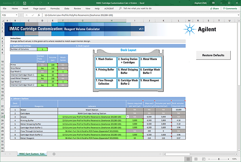• Cartridge Wash Buffer 2. This solution flushes any remaining Metal Reagent from the cartridges and leaves them in a state ready for immediate use or for short-term storage. For storage guidelines, see AssayMAP cartridges.The Reagent Volume Calculator is an Excel worksheet that you access from the Protein Sample Prep Workbench. The calculator uses formulas to calculate estimated volume requirements for buffers and reagents. Based on the number of cartridges to process, the calculator manages the dead volume, pipetting overage, and evaporation concerns for your experiment.