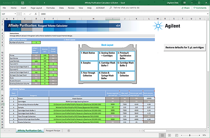 • Calculator worksheet. You enter the number of columns to process, the volume for each step in the protocol, and the labware selection for each deck location. The calculator determines the volumes required based on your input, taking into consideration pipetting overage and evaporation concerns.