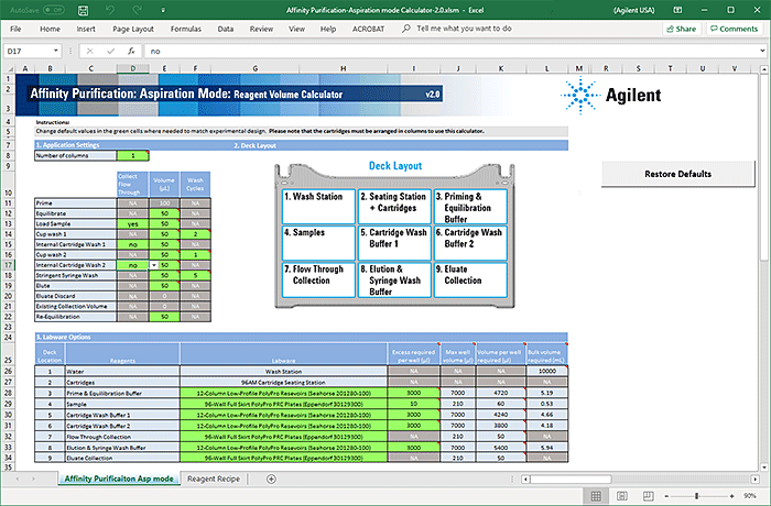 • Calculator worksheet. You enter the number of columns to process, the volume for each step in the protocol, and the labware selection for each deck location. The calculator determines the volumes required based on your input, taking into consideration pipetting overage and evaporation concerns.