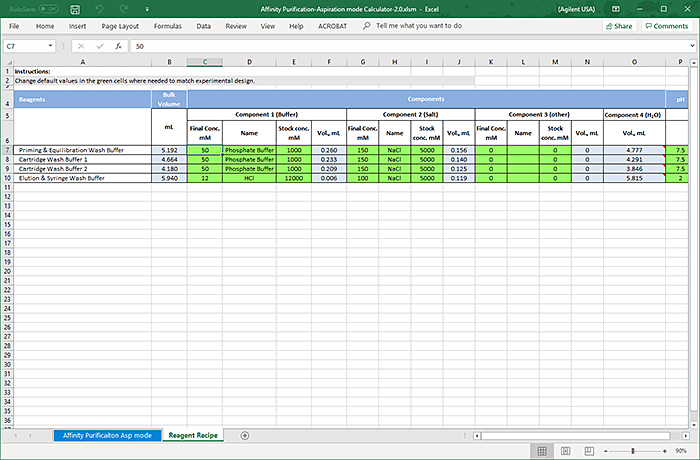 • Reagent Recipe worksheet. You enter the concentrations of each component in your reagent, and the worksheet calculates the recipe volumes required.