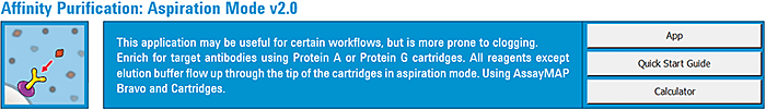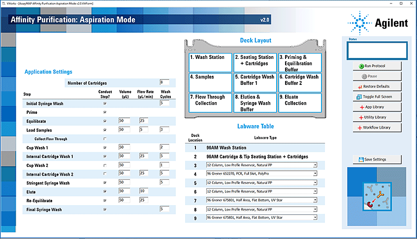 5 In the Application Settings area, specify the Number of Cartridges to use during the run. The position of the columns of cartridge in the tip seating station must match the positions of the samples and solutions in the plates on the deck.Ensure that you specify the number of cartridges for the Affinity Purification: Aspiration Mode app instead of the number of columns, which is the setting used in the other AssayMAP apps. Also, make sure to design experiments in a column format to avoid droplets falling on the deck as described in Planning the microplate setup.