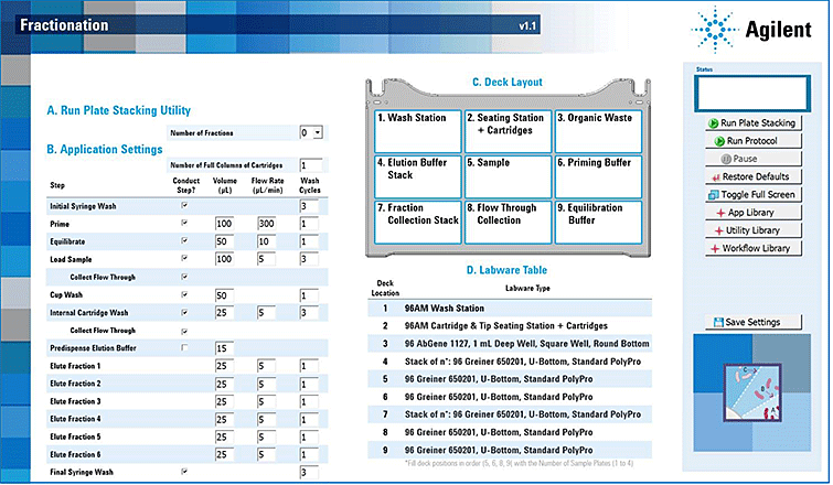 You must prepare stacks of pre-filled Elution Buffer plates and empty Fraction Collection plates on the Bravo deck before running the Fractionation protocol. Use the Plate Stacking protocol to stack the plates.