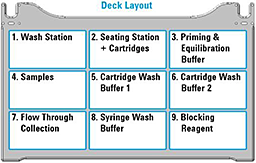 For more details about the available cartridges, see the Agilent AssayMAP Bravo Cartridges Selection Guide.The following figure shows the nine Bravo deck locations for labware.