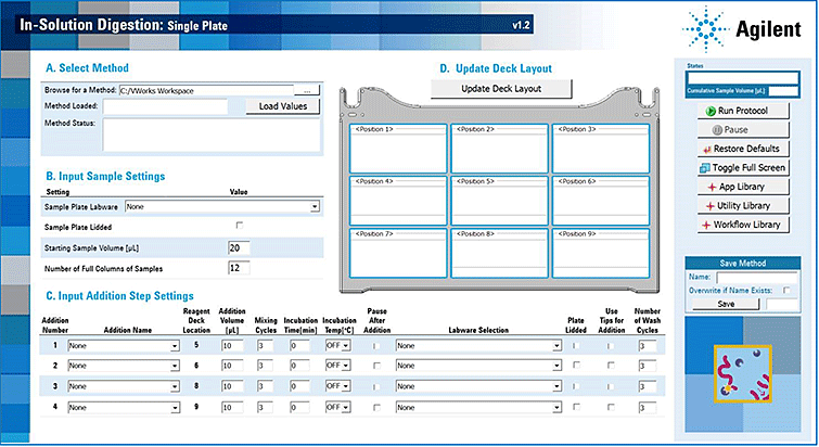 • Run Protocol. Executes a run using the settings shown in the App interface. After this button is clicked and before any hardware motion occurs, a series of error checks are conducted to verify that the digestion procedure has been properly specified.