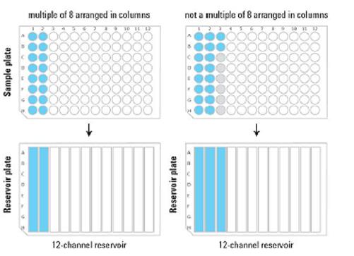 • The default protocol settings assume that samples will be arranged in multiples of 8 in a column-based configuration. Also, the AssayMAP Bravo Platform applies differential pressure to seat cartridges based upon the number of full columns of cartridges. To achieve proper cartridge seating, entire columns must be used.