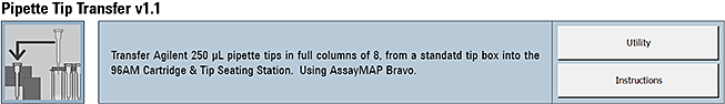 The Pipette Tip Transfer utility moves 1–12 columns of Agilent 250-µL pipette tips from a source tip box at AssayMAP Bravo deck location 6 into an empty 96AM Cartridge & Tip Seating Station at deck location 2. This utility is designed to transfer contiguous, full columns of tips, where each column has eight pipette tips.On the AssayMAP Bravo deck, make sure: