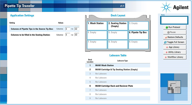 2 Confirm that the physical layout on the AssayMAP Bravo deck matches the Deck Layout and Labware Table sections of the interface.