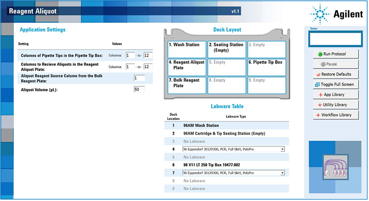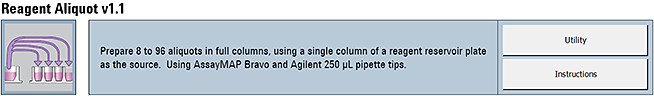 The Reagent Aliquot utility aliquots a reagent from a single column or reservoir of a Bulk Reagent storage plate into 1 to 12 columns of a 96-well microplate (Reagent Aliquot plate). The utility uses a single column of eight Agilent 250-µL pipette tips to prepare the aliquots.Note: You can find the Labware Reference Guide in the Literature Library page of the Protein Sample Prep Workbench.