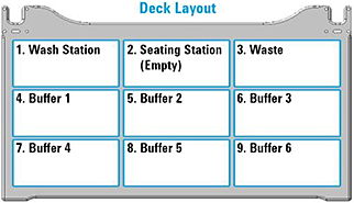 7 Place the labware on the AssayMAP Bravo deck locations, as shown in the Deck Layout area.For volume overage requirements for a given labware type, see the Labware Reference Guide in the Literature Library page of the Protein Sample Prep Workbench.
