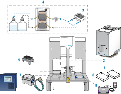 The AssayMAP Bravo Platform is required for running the AssayMAP protocols. The following figure and table describe the platform components.Figure. AssayMAP Bravo Platform components