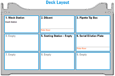 The following table lists the labware options by deck location for the diluent reservoir and the serial dilution plate. For dimensionally equivalent alternatives, well capacities, volume overages, and other labware details, see the Labware Reference Guide in the Literature Library page of the Protein Sample Prep Workbench.