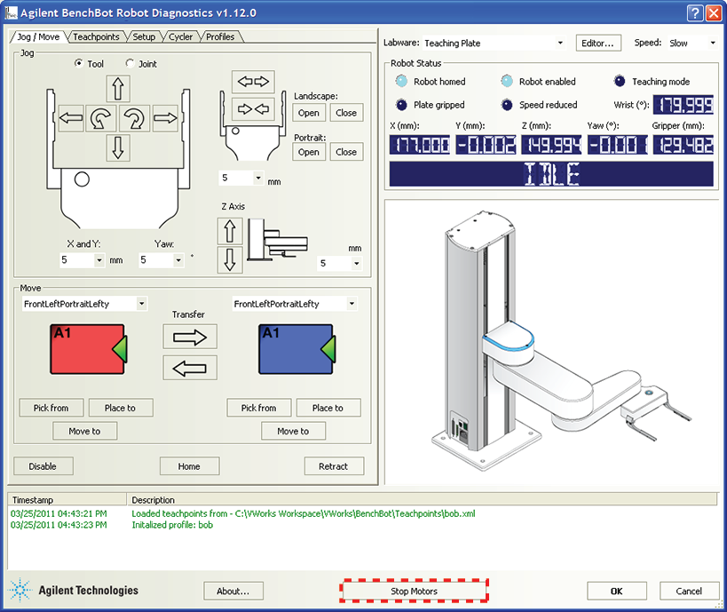 WARNING Using the Stop Motors command is similar to pressing the red button on the emergency-stop pendant. Both the Stop Motors command and the emergency stop button stops the BenchBot Robot only. In an emergency, you should use the system-wide emergency stop button to stop all devices immediately. For more safety information, see the BenchBot Robot Safety and Installation Guide.IMPORTANT The Stop Motor command cuts power to the joint motors only. Therefore, you can move the robot by hand in the plane of the robot arm. The z-axis brake keeps the robot arm from falling.In BenchBot Robot Diagnostics, click Stop Motors at the bottom of the dialog box. The robot stops immediately.