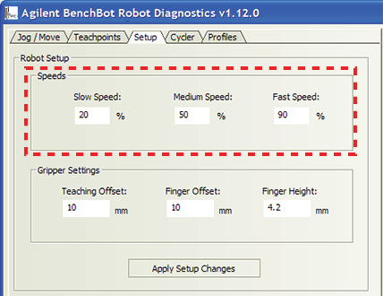 BenchBot Robot Diagnostics (Jog, Move, Transfer, and so on). If the robot is holding a labware, the slower of the following will be applied: the speed you selected in the Labware Editor, or the speed you selected in