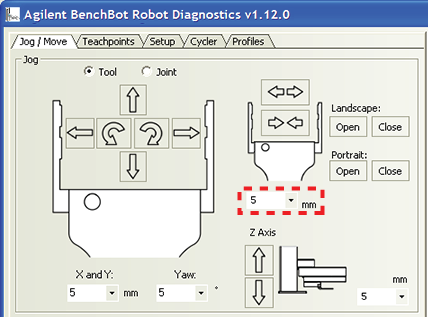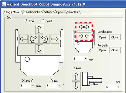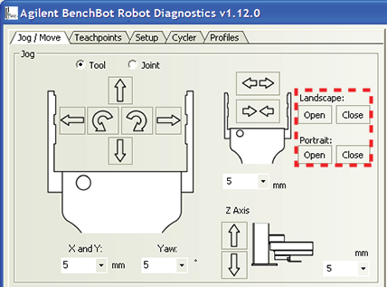 Opening and closing the robot grippers Procedure You can open the robot grippers to release labware. You can close the robot grippers to hold labware. You can open and close the grippers in one of two ways: • Use the software commands in BenchBot Robot Diagnostics. • Manually pull open and push close the grippers when the motors are disabled or in the teach mode only. IMPORTANT Manually pulling open or pushing closed the grippers while the motors are enabled will disable the motors. This topic explains how to use the software commands in BenchBot Robot Diagnostics to open and close the grippers. WARNING Be sure to wear protective eyewear when entering the system and working with the robot. WARNING Stay out of the system while the robot is in motion. To open or close the robot grippers using software commands: In the Jog/Move tab, click Open or Close for the desired orientation. To open or close the grippers incrementally: 1 In the Jog/Move tab, select or type the jog increment for the grippers. CAUTION Always select smaller jog increments so that the robot does not bump into obstacles when it opens its grip, or bend the labware when it closes its grip. IMPORTANT The jog increment applies to both grip directions. 2 Click either the Open or Close gripper button. Related information For information about... See... Homing the robot Homing the robot and grippers Moving the robot into the robot zone Retracting the robot into the robot zone Disabling and enabling the robot motor Disabling and enabling the robot joint motors Stopping the robot motors Stopping the robot motors Changing the robot speed Changing the robot speed Changing the robot speed definitions Changing the robot speed definitions Jogging the robot Jogging the robot Changing the gripper settings Changing the gripper settings View the Robot Status area Checking the robot status and log Viewing the log area Checking the robot status and log Updating the firmware Updating the firmware Backing up the robot firmware Backing up the robot firmware Installing new or restoring existing firmware Installing new or restoring existing firmware