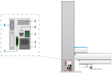 Connects the BenchBot Robot power cord to an AC outlet with a grounded circuit. Connects the BenchBot Robot to the controlling computer. Contains the serial number of the robot. You must provide this number when reporting problems to Automation Solutions Technical Support. IMPORTANT Do not remove the jumper that is installed on the port. The robot will operate only if the jumper remains on the port. If the jumper is missing, contact Automation Solutions Technical Support. Connects the BenchBot Robot to the emergency-stop pendant.For more information about the pendant port connection, see the BenchBot Robot Safety and Installation Guide.The BenchBot Robot is equipped with an emergency-stop pendant. Pressing the red button decelerates and stops the robot. The z-axis brake engages to prevent the robot arm from falling freely.
