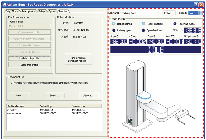 Robot status area Selection or command Description Labware Allows you to select a labware. Editor Opens the Labware Editor. Speed Sets the robot speed: Slow, Medium, or Fast. Robot homed Indicates the robot has homed successfully. Robot enabled Indicates whether the robot motor is enabled. Plate gripped Indicates the presence of labware in the robot grippers. Speed reduced Indicates that the robot is moving in the reduced-speed mode. Teaching mode Indicates if the robot is in the teach mode. X (mm) Displays the current x-axis coordinate. Y (mm) Displays the current y-axis coordinate. Z (mm) Displays the current z-axis coordinate. Yaw (°) Displays the current angle between the grippers and the x-axis. Gripper (mm) Displays the current distance, in millimeters, between the inside surface of the grippers. When the grippers are homed, the distance is 130 mm. Wrist Displays the current angle of the robot wrist. Status message Displays the current status of the robot.