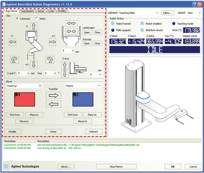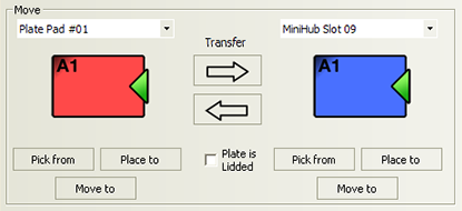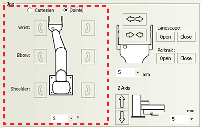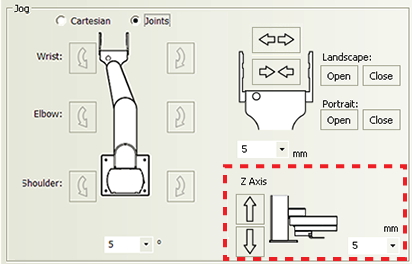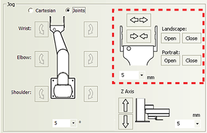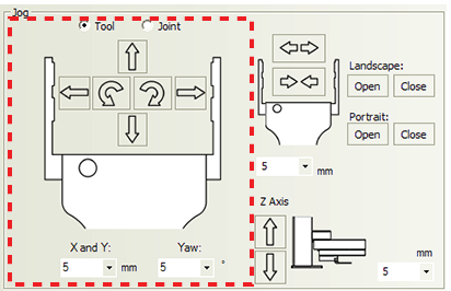 Jog/Move tab General commands Command Description Disable/Enable Disables or enables the robot joint motors. When disabling the motors, the robot will first finish the current command before stopping. For safety reasons, disabling the motors disables the joint motors only. You cannot disable the z-axis motor. Home Initializes the encoders with the correct position information, and then sends the robot to the neutral position in the robot zone. Retract Enables the robot to search for the closest teachpoint, and then use the path from that teachpoint to neutral (x, y) position in the robot zone. If the robot is unable to find a teachpoint nearby, it will retract directly into the robot zone. Jog area: Tool space commands and parameters Command or parameter Description Tool Displays the jog buttons to move the labware to a target Tool coordinate (x, y, yaw). In Tool space, all movements are measured with respect to the center of the labware. Tool space jog buttons: X: Y: Yaw: Jogs the robot in the specified direction by the specified distance in millimeters or by the specified angle in degrees. X and Y jog increment Specifies the distance, in millimeters, the robot moves when you click an x-or y-axis jog button. Yaw jog increment Specifies the angle, in degrees, the labware rotates when you click a rotating jog button. Jog area: Joint space commands and parameters Command or parameter Description Joint space Displays the jog buttons to rotate the robot’s bicep about the shoulder joint, rotate its forearm about its elbow joint, and rotate its hand about the wrist joint. Wrist/Elbow/Shoulder jog buttons: Jogs the robot in the specified direction by the specified degrees. Joint jog increment Specifies the angle, in degrees, the robot rotates when you click a rotating jog button. Jog area: Gripper commands and parameters Command or parameter Description Landscape: Open/Close Opens or closes the robot grippers to accommodate the landscape labware orientation. By default, the open distance for the landscape orientation is 132 mm. Portrait: Open/Close Opens or closes the robot grippers to accommodate the portrait labware orientation. By default, the open distance for the portrait orientation is 95 mm. Gripper jog buttons: Opens or closes the robot grippers by the specified distance. Gripper jog increment Specifies the distance, in millimeters, the robot grippers move when you click an open or close gripper jog button. Jog area: Z-axis commands and parameters Command or parameter Description Z Axis jog buttons: Jogs the robot along the z-axis in the specified direction by the specified distance. Z Axis jog increment Specifies the distance, in millimeters, the robot moves when you click one of the Z Axis jog buttons. Move area Selection or command Description Teachpoint selection Allows you to select from the list of available teachpoints. Transfer buttons: Picks up labware from a selected teachpoint and places the labware at the other selected teachpoint. Plate is Lidded Indicates that the labware you are moving has a lid and will be picked up or placed at a Lid Hotel Station or a Vacuum Delid Station. Note: The check box appears only if you select a labware that can have lids. Pick from Picks up labware from the selected teachpoint. Place to Places labware at the selected teachpoint. Move to Moves the robot grippers to the selected teachpoint.