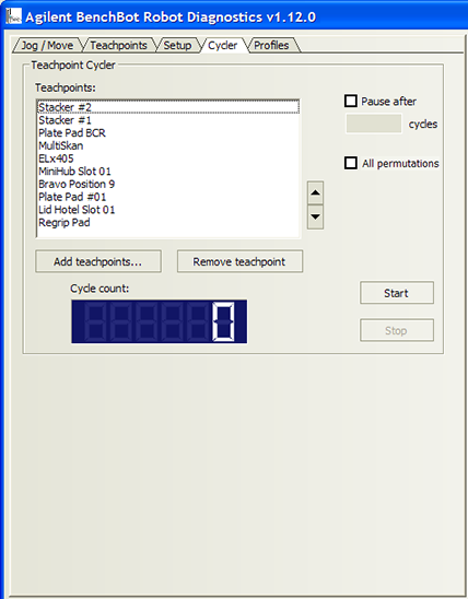 Cycler tab Command or option Description Add teachpoints Allows you to select the desired teachpoints from the existing teachpoints list. Remove teachpoints Removes the selected teachpoints from the Teachpoints list. Pause after ___ cycles Pauses the cycling after the specified number of cycle times. All permutations Runs the all-permutations cycling sequence. Start Starts or pauses the cycling. Stop Stops the cycling. The robot will stop after the current pick-and-place action. Cycle count Displays the number of completed cycles.