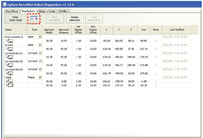 • For instructions, see the VWorks Automation Control Setup Guide.The teachpoints you set are saved in the XML format in a teachpoint file. The default teachpoint file name is Teachpoints_<profilename>.xml, where <profilename> is the name of the profile. The software saves the file in the C:\VWorks Workspace\VWorks\BenchBot\Teachpoints folder. However, you can select another file name and location when saving the file.