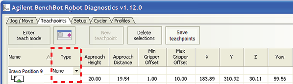 Select None for teachpoints that do not have special functions. For example, you should select None for platepads and most device locations. By default, None is the teachpoint type selection.