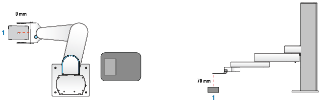 In the following diagram, the teachpoint (1) does not have obstacles nearby. In this case, set the Approach Distance at 0 mm to take advantage of the robot’s rotating movement. Because the tallest labware expected at the teachpoint is a tipbox, the Approach Height is set at 70 mm.