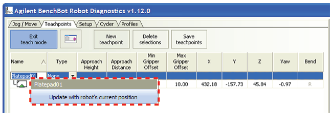 3 Select Update with robot’s current position. The teachpoint coordinates are updated.