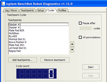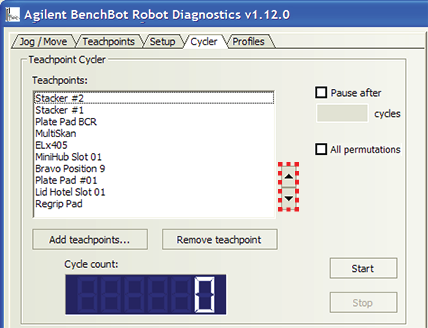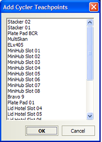 4 Click OK to return to the Cycler tab. The selected teachpoints appear in the Teachpoints list.