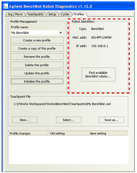 4 When you are finished, click OK to return to the BenchBot Robot Diagnostics dialog box. Notice that the Device type, MAC address, and IP address of the robot appear in the Robot Identifiers area.