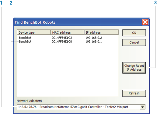 In the Network Adaptors list, select the Ethernet card that is connected to the robot. A list of devices that are connected to the selected card appear in the dialog box. Select the desired BenchBot Robot. You can use the MAC address to identify the robot in the list. If you have more than one BenchBot Robot in the system, make sure each robot has a unique IP address. To do this, turn off all but one robot in the system, select the robot in this dialog box, click Change Robot IP Address, and then assign a new IP address. The IP address should have the same network and subnet address as the controlling computer, and have a unique host address. Repeat for each robot in the system.