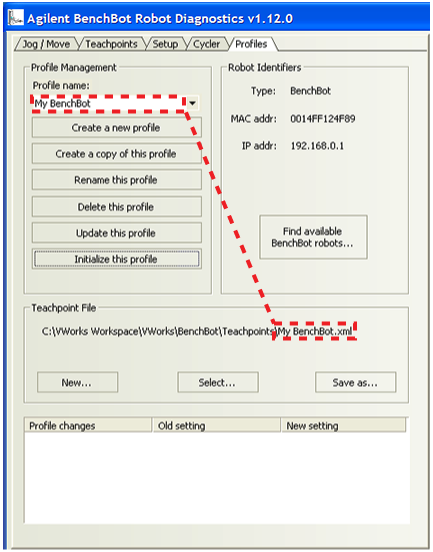 Every BenchBot Robot profile must be associated with a teachpoint file. When you create a profile, the software automatically creates a new default teachpoint file. Its location is shown in the Teachpoint File area. The file name is teachpoint_<profilename>, and the file remains empty until you set teachpoints.