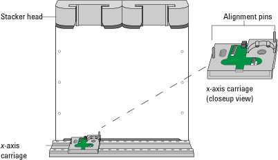 2 Slide the x‑axis carriage into position directly under a stacker head opening.