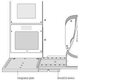 • Two integration plates for the BenchCel deviceInstalling the BenchCel device integration plateThe BenchCel device integration plates have locking mechanisms that keep the BenchCel device and any external device in position during a run. The integration plates must be installed under the BenchCel device.To install the BenchCel device integration plate: