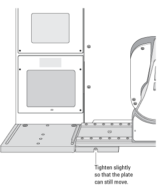 4 Use the 3-mm hex wrench to slightly tighten the BenchCel device integration plate clamp screw. You will not tighten the screw all the way until the devices are correctly aligned.Figure. Integration plate clamp screw