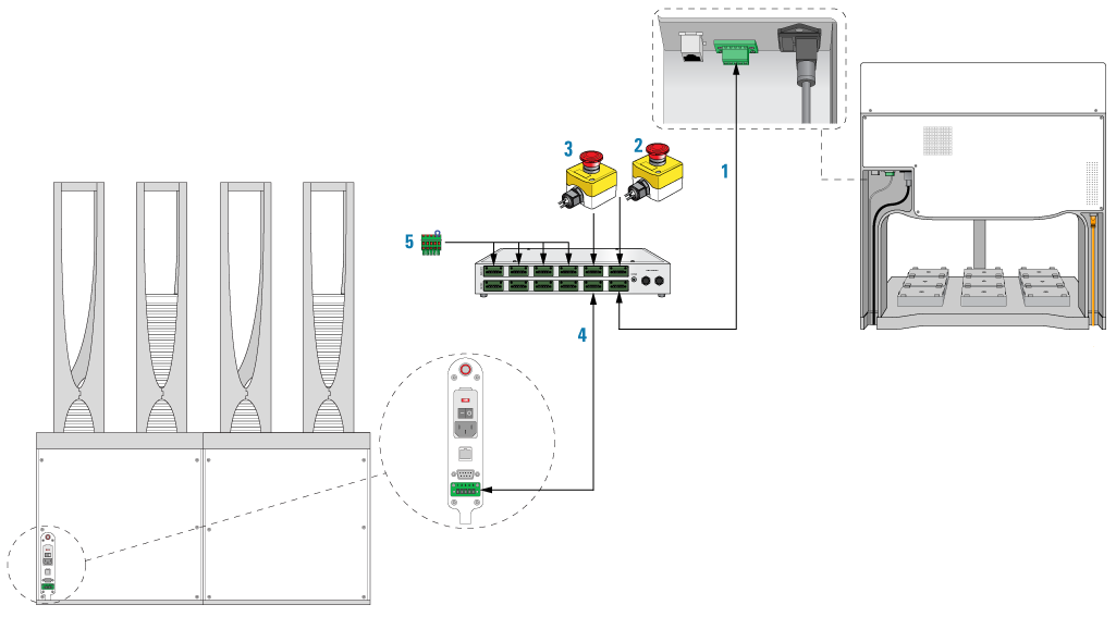• Provides the emergency-stop function for the BenchCel robot and up to five integrated devices that are equipped with safety interlock circuitry.Figure. Robot Disable Hub