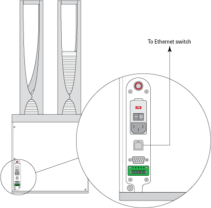 • Ethernet connection. You can use the supplied Ethernet cable to connect the computer to the BenchCel Microplate Handler. The Agilent Technologies configured computer has two Ethernet ports. You can use one port to connect to the BenchCel Microplate Handler and the other to connect to your company network.To connect the controlling computer to the BenchCel Microplate Handler: