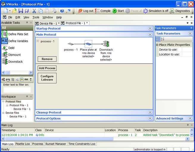 • Run, pause, monitor, and stop protocols. You can start, pause, monitor, and stop a protocol run from the controlling computer. For details, see the VWorks Automation Control User Guide.Figure. VWorks software window
