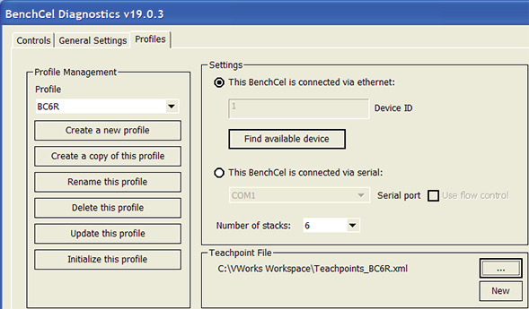 • Create and manage profiles. The software uses the information in the profile to communicate between the BenchCel device and the controlling computer. You create profiles using the BenchCel Diagnostics Profiles tab when you set up the BenchCel Microplate Handler.Figure. BenchCel Diagnostics Profiles tab