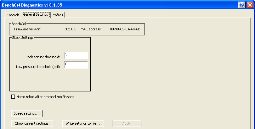 • Change general device settings. After diagnosing problems, you can change some of the device settings to repair problems or to optimize operation.Figure. BenchCel Diagnostics General Settings tab