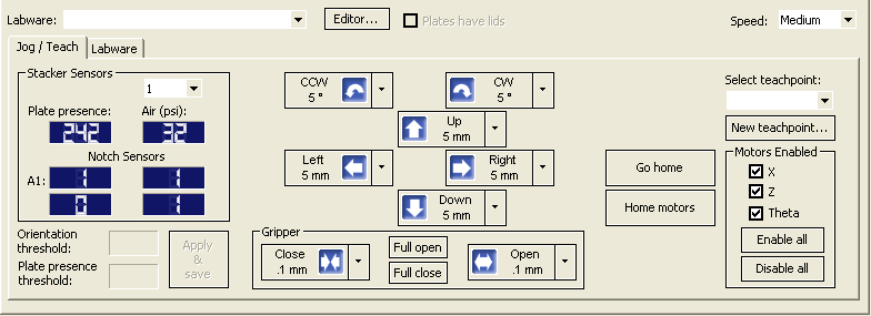 • Set and edit teachpoints. Teachpoints are locations that the BenchCel robot will go to and from during a protocol run. You set teachpoints using the BenchCel Diagnostics Controls tab when you set up the BenchCel Microplate Handler.Figure. BenchCel Diagnostics Controls tab