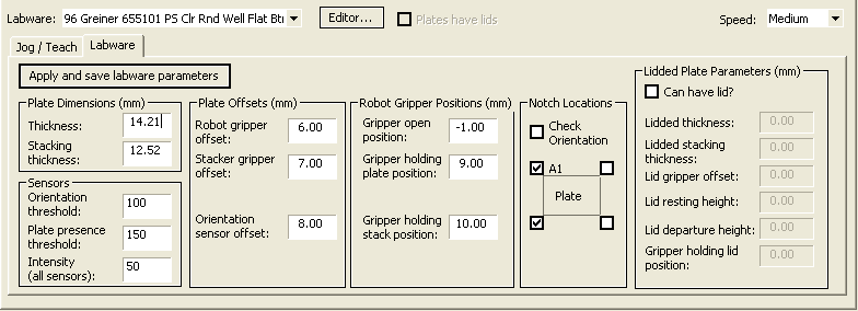 While testing new or troubleshooting labware definitions, you can change parameters to refine the labware definition. BenchCel Diagnostics includes a Labware tab on the Controls page, which enables you to adjust the labware definitions. Alternatively, you can use the Labware Editor to update the labware definitions.Figure. BenchCel Diagnostics Labware tab