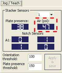• Stacker gripper pressure. Make sure the pressure is set correctly. On the Controls page in BenchCel Diagnostics, click the Jog/Teach tab, and check the Air reading.