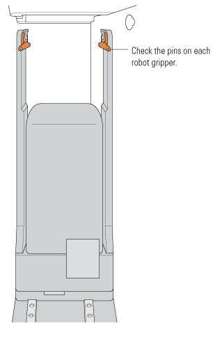• Robot gripper pins. Make sure they are not too dull to grip the microplates. If the pins have become dull, contact Automation Solutions Technical Support to replace them.Figure. Robot head (side view)