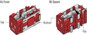 • 230 V power. Inspect the fuses on each side of the cartridge, and then replace the suspect fuse.Figure. Fuse cartridge for 115 V: A) Right side with correctly installed fuse, B) Left side with spare fuse