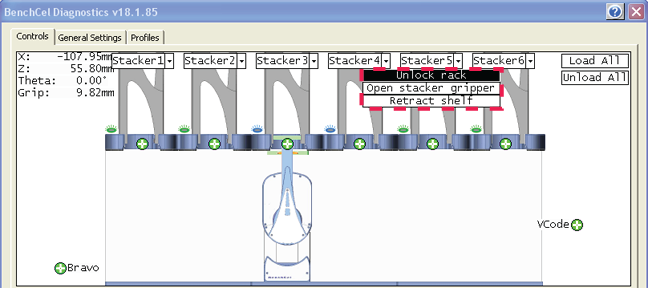 • In BenchCel Diagnostics, click the Controls tab. In the graphical display area, at the top of the rack that you want to unlock, click Stacker, and then choose Unlock rack. A click sounds as the locks retract.