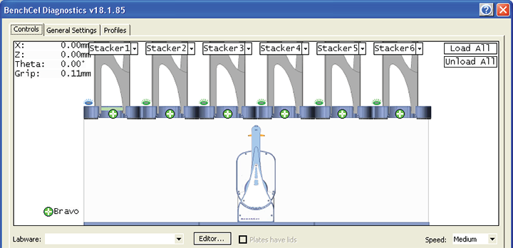 Specifies the relative speed at which the robot head and arms moves: Fast, Medium, and Slow. Changing the robot speedThis speed control applies only in BenchCel Diagnostics. Lidded labware only. Removes the lid from the labware that is at the selected teachpoint. Lidded labware only. Replaces the lid on the labware that is at the selected teachpoint.