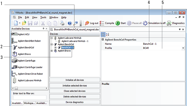 5 In the Profile list, select a profile for the device.If the Profile list is empty, open BenchCel Diagnostics and create a profile. Then return to the Profile list under BenchCel Properties and select the new profile.