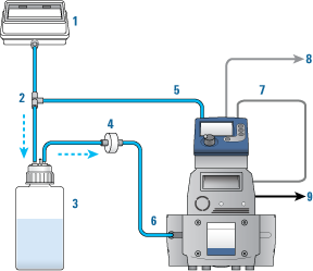 3 Connect the output tubing from the waste bottle (3) to the filter (4), and connect the output tubing from the filter to the inlet on the front of the pump (6).