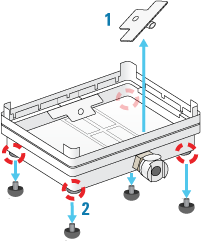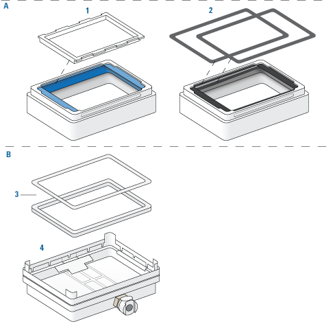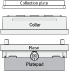 The collar is available in standard and deep-well models. The deep-well collar is required to accommodate plate-on-plate stacking for deep-well microplates. The Bravo device profile configuration specifies the collar size. The same collar as item 1, except the flexible blue gasket is replaced with two black gaskets that are held in place by an adhesive. One black gasket adheres to the top of the collar, and the second black gasket adheres to the underside surface of the collar top to maintain the correct spacing underneath the collar. For more details about the Vacuum Filtration Station collar and base, see the Millipore user documentation.Ensure that the base of the station is installed on a short platepad (SRT platepad). If the Vacuum Filtration Station configuration is too tall for the Bravo gripper to assemble without the risk of a collision, an error will occur during the run.
