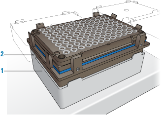 5 Reposition the Magnetic Bead Accessory on the platepad, as shown in the following figure (1). Ensure that the accessory is fully seated on the platepad.